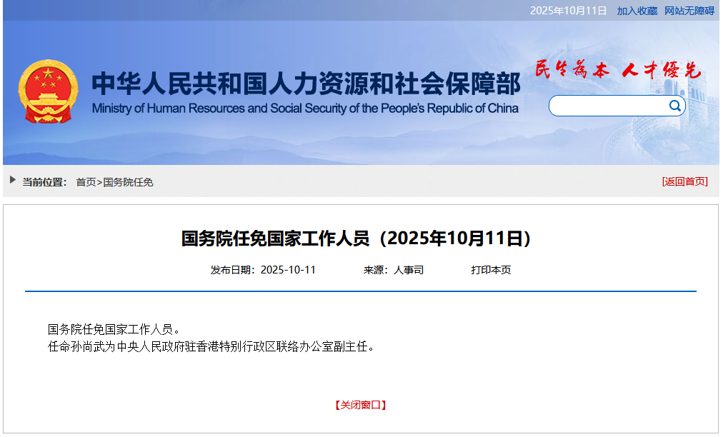 任命孙尚武为中央人民政府驻香港特别行政区联络办公室副主任。